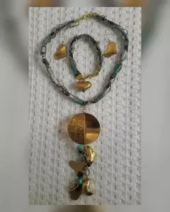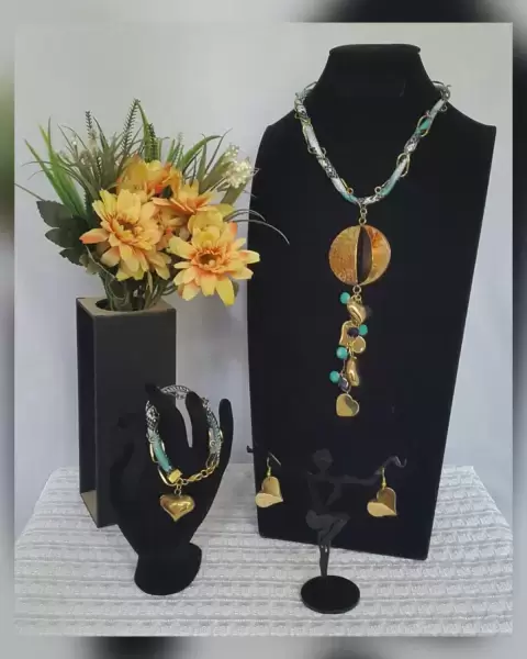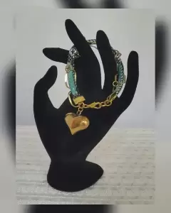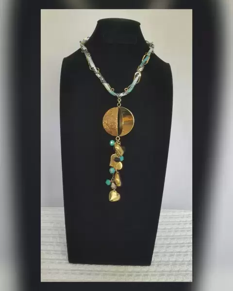 Juego de gargantilla, pulsera y aretes en fake fur trenzado efecto reptil en colores BLANCO/NEGRO/TURQUESA c/dije circular y corazones, cadenas y bisutería tono TURQUESA. Dimensiones cms: 42 largo, 17 largo aplique, 18 largo pulsera, 4 aretes.