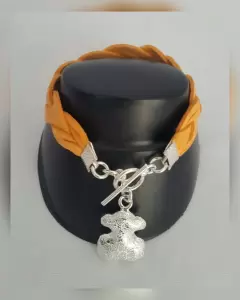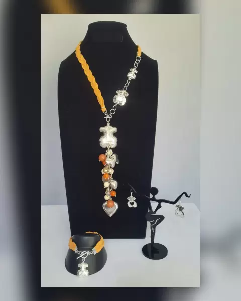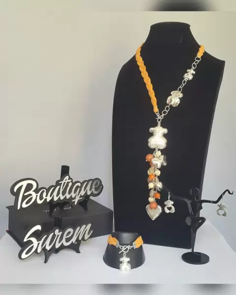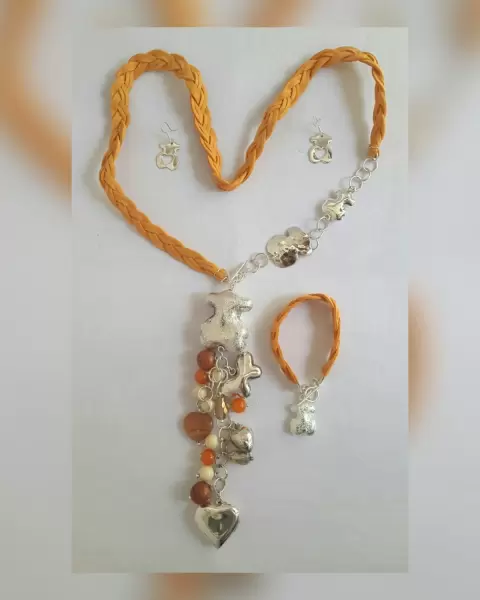 Juego Bisuteria Ositos color Carrot. Juego de bisutería ositos en fake fur color CARROT y bisutería tono PLATA BRILLANTE/TIERRA, collar trenzado c/bisutería ositos, mariposa, corazones y esférica multicolor, pulsera trenzada y aretes a jgo. Dimensiones cms: 93 largo collar, 18 largo pulsera, 4x2 aretes. Fake fur y aleación zinc.
