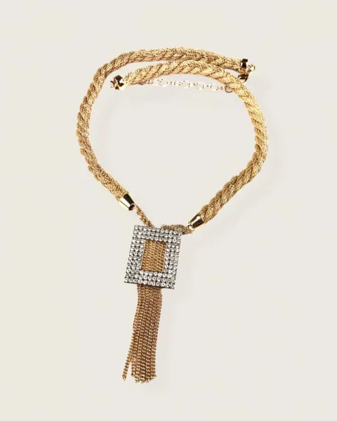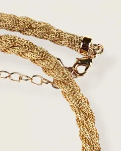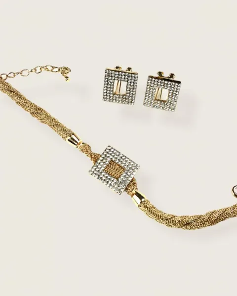 Collar, pulsera y aretes en un fino trenzado de acero inoxidable, decorado con cristales distribuidos de manera uniforme.