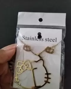 Paquete de 1 collar y unos aretes, de acero inoxidable, color dorado y con la cara de Hello Kitty, los collares están de buen tamaño y los aretes tienen broche de mariposa, pregunta disponibilidad de letras (NO hay "X" ni "Z").Si tienes dudas puedes preguntar sin compromiso.