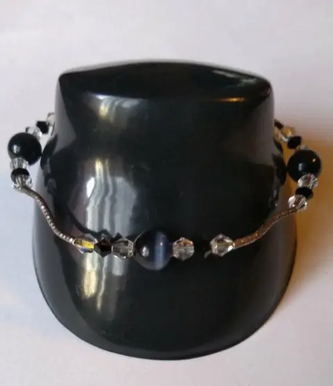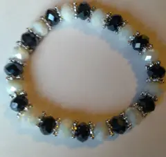 Dos pulseras y un anillo con cuentas de cristal en color negro blanco y trasparente