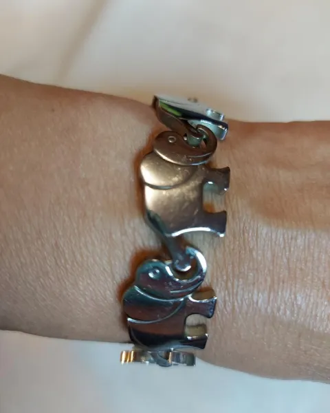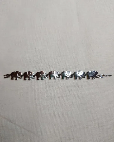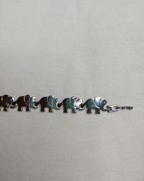 Linda pulsera de elefantes color plateada, los elefantes se ven muy lindos. No se de que material sea! Tiene algunos rayones. No está despintada. Mide aproximadamente 18cm.