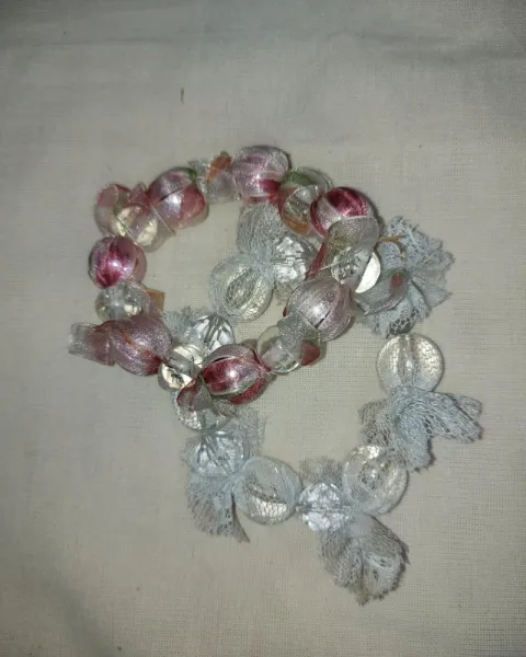 Lindas pulseras de bolitas una con listón y otra con encaje, se ven muy lindas puestas. Una es blanca la de encaje y la otra oredimina el color rosa! 😍🥰 Hechas a mano!
