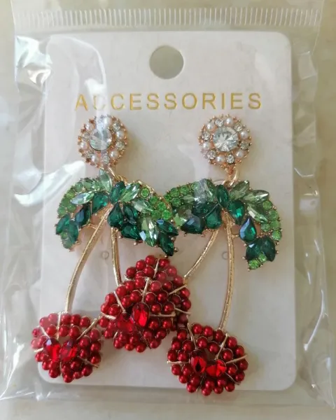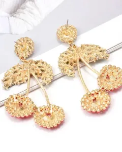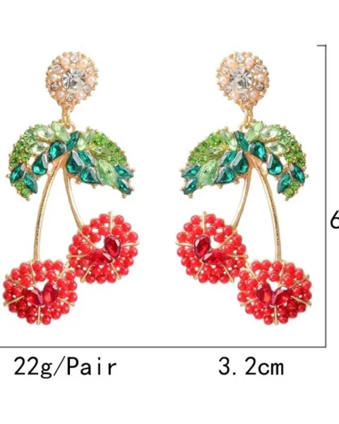 Aretes largos color dorado, en forma de cerezas, con pedrería de fantasía verde y roja.Largo: 6.8 cm, ancho: 3.2 cm, peso: 22 g el par.