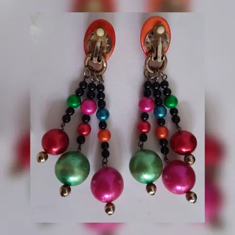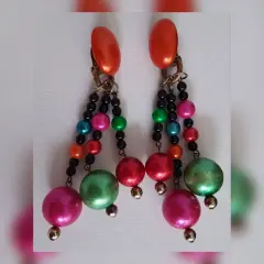 Maxi Aretes VINTAGE largos c/esferas MULTICOLOR, cierre p/clip y son ligeros. Dimensiones cms: 11.5 largo, 3 ancho. Aleacion zinc y sintético ***ESTÁN EN BUEN ESTADO, LOS USE MUY POCO Y SOLO ESTUVIERON GUARDADOS. EN LA ZONA DEL CLIP EL TONO EMPIEZA A CEDER, PERO ES MUY POCO.***SE ENTREGAN LIMPIOS Y DESINFECTADOS.***