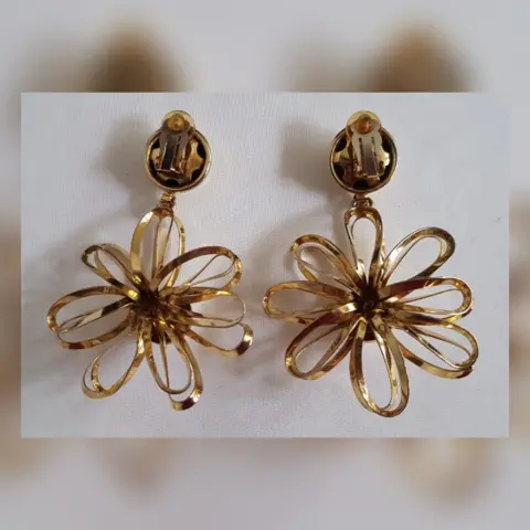 Maxi Aretes VINTAGE en forma de flor tono DORADO, cierre p/clip y son muy ligeros. Dimensiones cms: 9 largo, 6 circunferencia. Aleacion zinc.***ESTÁN EN BUEN ESTADO, LOS USE MUY POCO Y SOLO ESTUVIERON GUARDADOS. EN LA ZONA DEL CLIP EL TONO EMPIEZA A CEDER, PERO ES MUY POCO.***SE ENTREGAN LIMPIOS, PULIDOS Y DESINFECTADOS.***