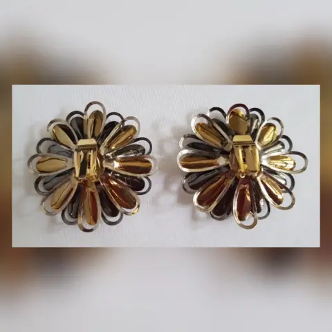 Maxi Aretes Vintage Margaritas. Maxi Aretes VINTAGE en forma de margaritas bitono DORADO/PLOMO, c/aplique circonía, cierre p/clip y son ligeros. Dimensiones cms: 6 circunferencia. Aleacion zinc.***ESTÁN EN MUY BUEN ESTADO, NUNCA LOS USE Y SOLO ESTUVIERON GUARDADOS.***SE ENTREGAN LIMPIOS, PULIDOS Y DESINFECTADOS.***