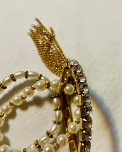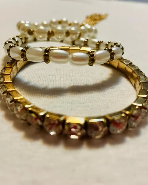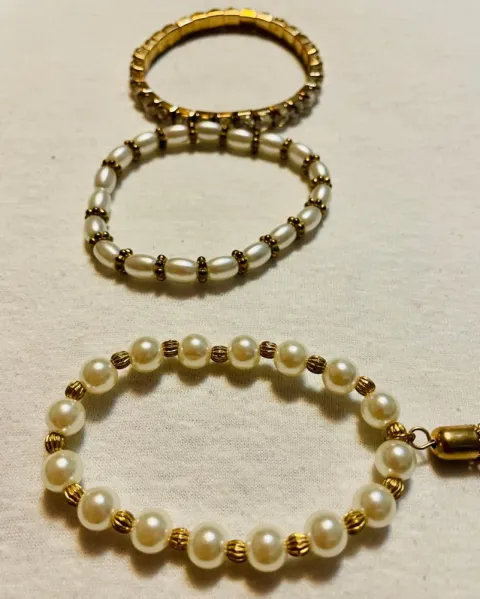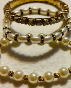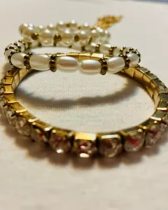 Paquete de 3 pulseras de perlas y diamantes, con detalles de baño oro, elásticas. Úsalas juntas o por separado, cada una luce especial.