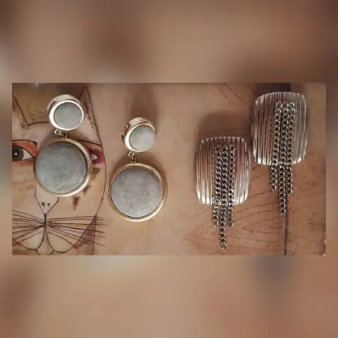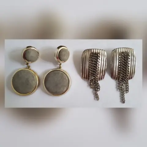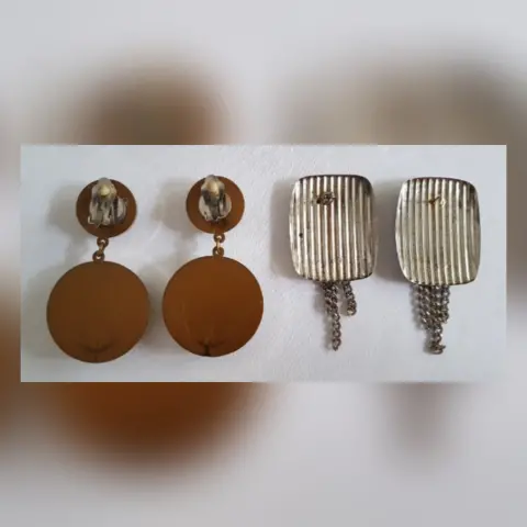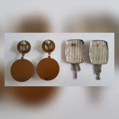 Paquete 2 pares aretes vintage. 1 par Bitono GRIS AGATA/DORADO redondos efecto gamuza y cierre p/clip. 1 par tono PLATEADO rectangulares y cierre presión. Dimens cms: Redondos 7 largo, 4 circunferencia; rectangulares 4.5 largo, 3.5 ancho. Aleación zinc y textil.**LOS REDONDOS LOS USE 1 VEZ Y LOS RECTANGULARES NUNCA LOS USE, SOLO ESTUVIERON GUARDADOS.**SE ENTREGAN LIMPIOS, PULIDOS Y DESINFECTADOS**