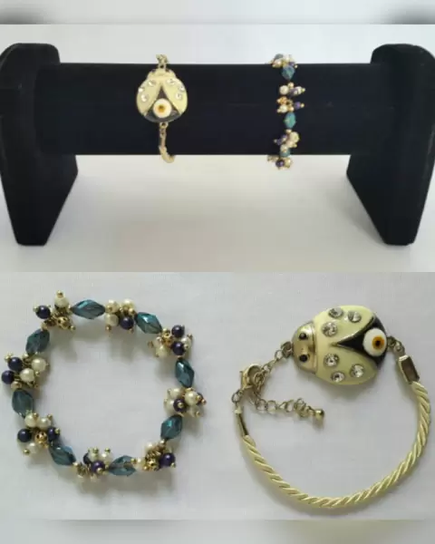PAQUETE 2 pulseras bisutería fina. Pulsera multiengarzada autoajustable c/perlas de imitación y bisutería en tonos AZUL TORNASOL/MORADO. Pulsera cordón trenzado tono MARFIL c/dije catarina c/pintura esmaltada y bisutería translúcida c/cierre p/broche lobster claw. Dimensiones cms: Engarzada 6 circunferencia, catarina 17 largo + 6 extensor. Aleación de zinc.
