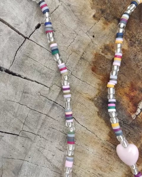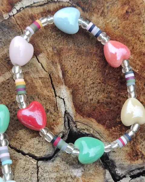 *Paquete de dos collares y pulsera*Hecho de fimo, corazones de porcelana, letra que desee bañada en oro y elástico resistente