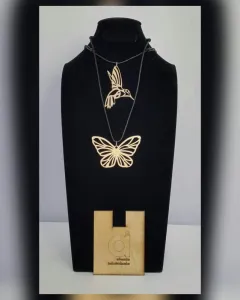 PAQUETE de dos collares con dijes de colibrí y mariposa en madera (no es MDF) laqueada tono DORADO y cordón encerado autoregulable. MEDIDAS CMS: 7.5 x 5 colibrí, 5.5 x 8.5 mariposa, desde 41.5 hasta 77 cordón.***PRECIO NO NEGOCIABLE*** Por favor, no regatees, estos productos son elaborados por personas que perdieron su empleo y su venta les ayuda a llevar el sustento a su familia. ¡Ayúdame a ayudarlos!***Puedes comprarlos así o solicitar algún dije de cualquiera de los otros paquetes con el mismo precio, ya sea el mismo color o distinto***