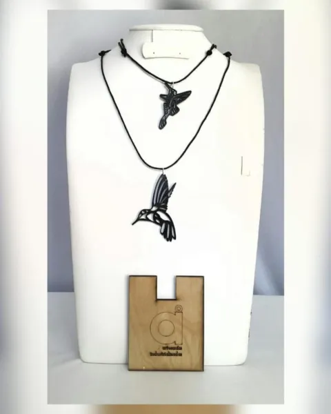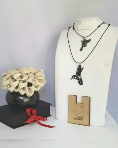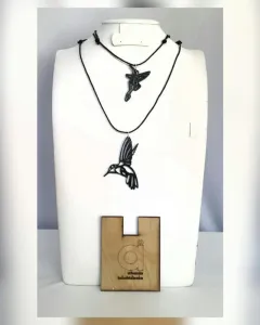 PAQUETE de dos collares con dijes de colibríes (chico y mediano) en madera (no es MDF) laqueada tono NEGRO ÉBANO y cordón encerado autoregulable. MEDIDAS CMS: 6 x 4 chico, 7.5 x 5.5 mediano, desde 41.5 hasta 77 cordón.***PRECIO NO NEGOCIABLE*** Por favor, no regatees, estos productos son elaborados por personas que perdieron su empleo y su venta les ayuda a llevar el sustento a su familia. ¡Ayúdame a ayudarlos!***Puedes comprarlos así o solicitar algún dije de cualquiera de los otros paquetes con el mismo precio, ya sea el mismo color o distinto***