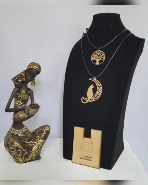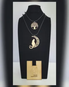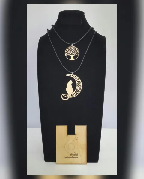 PAQUETE de dos collares con dijes de árbol de la vida y gato en la luna en madera (no es MDF) laqueada tono DORADO y cordón encerado autoregulable. MEDIDAS CMS: 4.5 x 4.5 árbol , 7.5 x 5.5 gato, desde 41.5 hasta 77 cordón.***PRECIO NO NEGOCIABLE*** Por favor, no regatees, estos productos son elaborados por personas que perdieron su empleo y su venta les ayuda a llevar el sustento a su familia. ¡Ayúdame a ayudarlos!***Puedes comprarlos así o solicitar algún dije de cualquiera de los otros paquetes con el mismo precio, ya sea el mismo color o distinto***