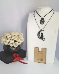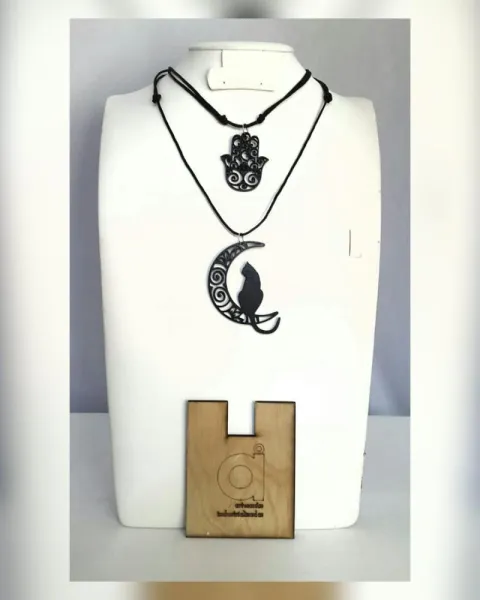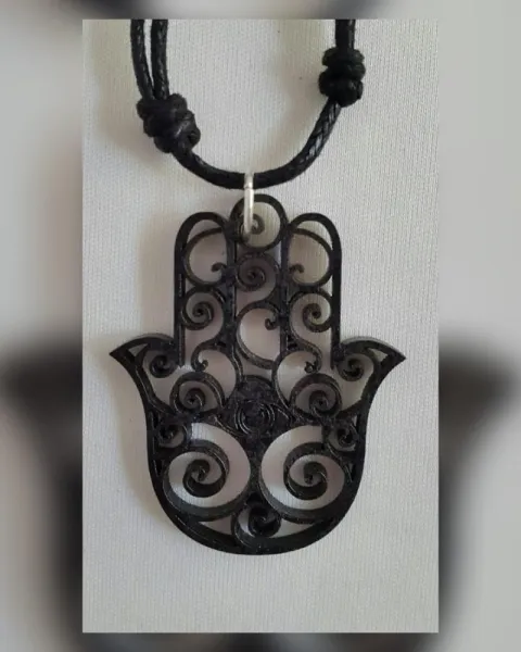 PAQUETE de dos collares con dijes de Hamsa (mano de Fátima) y gato en la luna en madera (no es MDF) laqueada tono NEGRO ÉBANO y cordón encerado autoregulable. MEDIDAS CMS: 5.3 x 4.5 Hamsa , 7.5 x 5.5 gato, desde 41.5 hasta 77 cordón.***PRECIO NO NEGOCIABLE*** Por favor, no regatees, estos productos son elaborados por personas que perdieron su empleo y su venta les ayuda a llevar el sustento a su familia. ¡Ayúdame a ayudarlos!***Puedes comprarlos así o solicitar algún dije de cualquiera de los otros paquetes con el mismo precio, ya sea el mismo color o distinto***El judaísmo, el islam y algunos cristianos de oriente conservan hasta hoy el motivo folclórico de la mano conocido como Hamsa, cuyo referente último probablemente sea la mano de Dios. Se trata de lo que en el pasado posiblemente haya sido empleado como un talismán pero se ha vuelto hoy un motivo de expresión de la fe monoteísta, apreciado por sefardíes y musulmanes como un recordatorio de Dios y una expresión de deseo de recibir sus bendiciones y protección. En la cultura popular, el Hamsa es también un motivo decorativo, pero, en principio, no posee el valor de un talismán o de medalla milagrosa ninguna. Con todo hay quienes le confieren un valor fetichístico (comparable al que algunos individuos le dan a una herradura o una pata de conejo, suponiendo que les traerá buena suerte). Pero más allá de ello, el Hamsa no constituye entre los grupos musulmanes o judíos un deje neopagano. Para ellos, el Hamsa simplemente constituye una expresión de deseo equivalente a Que Dios te vea y te bendiga/proteja. Cada grupo eventualmente asignaría la mano en cuestión a diferentes figuras, pero, iconográficamente, todas esas expresiones tienen por referente último a la mano de Dios.