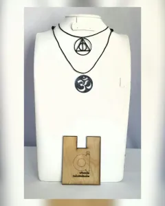 PAQUETE Dos Collares Simbología NEGRO. PAQUETE de dos collares con dijes de símbolos Om y Alquimico en madera (no es MDF) laqueada tono NEGRO ÉBANO y cordón encerado autoregulable. MEDIDAS CMS: 4.5 x 4.5 om, 5.5 x 5.5 alquimico, desde 41.5 hasta 77 cordón.***PRECIO NO NEGOCIABLE*** Por favor, no regatees, estos productos son elaborados por personas que perdieron su empleo y su venta les ayuda a llevar el sustento a su familia. ¡Ayúdame a ayudarlos!***Puedes comprarlos así o solicitar algún dije de cualquiera de los otros paquetes con el mismo precio, ya sea el mismo color o distinto***SIMBOLO OM: Significa unidad con lo supremo, la combinación de lo físico y lo espiritual. Sílaba sagrada, el primer sonido del todo poderoso, el sonido del que emergen todos los demás sonidos, ya sean de la música o del lenguaje divino.SIMBOLO ALQUIMICO: Este símbolo fue utilizado en la película de Harry Potter y según la historia, representa los tres artefactos de las reliquias de la muerte: la piedra de la resurrección, la capa de invisibilidad y la varita de Saucó.