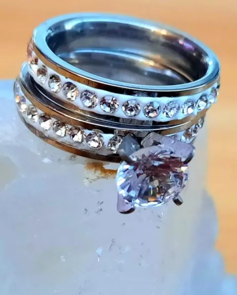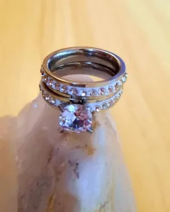 Precioso juego de anillos. Tipo de compromiso con una zirconia, el metal es acero inoxidable, y tiene cristalitos que super brillan, cuento con tallas 6, 7, 8 y 9. Están preciosos...