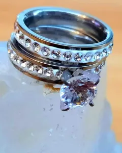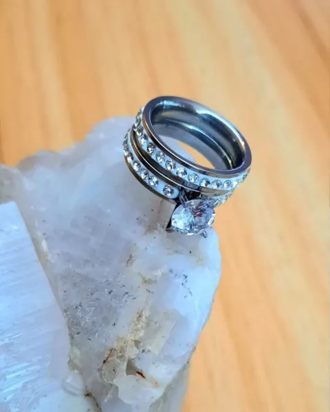 Tipo de compromiso con una zirconia, el metal es acero inoxidable, y tiene cristalitos que super brillan, cuento con tallas 6, 7, 8 y 9. Están preciosos...
