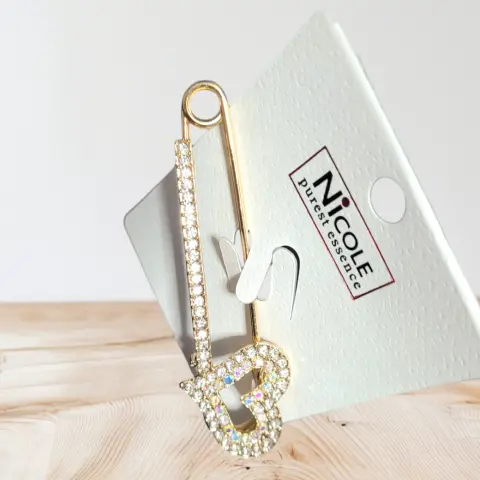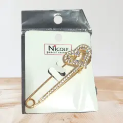 Prendedor en forma de Seguro Nicole. Prendedor en forma de Seguro Nicole con detalle de corazon con pedras brillosas, cierre de hook, color dorado con piedras blancas, elegante diseño para complementar tus atuendos y atraer miradas, mide 7.5cm de largo, nuevo a estrenar con etiqueta.