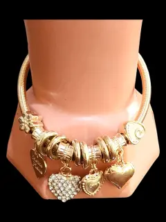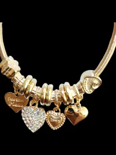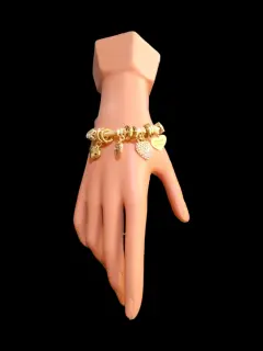 Pulcera de corazones pandora Fashion. Pulcera estilo pandora Fashion accesories, colores dorado y azul blanco de corazones y flores, hecha de metal inoxidable elastico, con dijes alrededor, mide 6cm de circunferencia, nueva a estrenar con etiqueta.