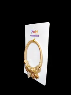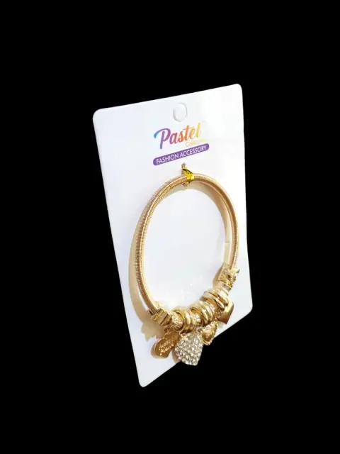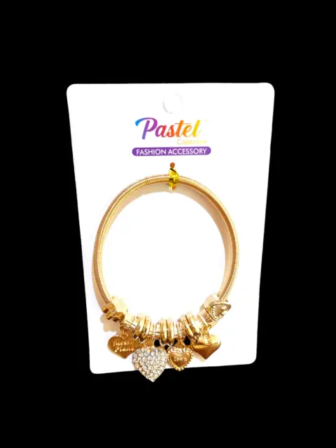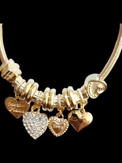 Pulcera estilo pandora Fashion accesories, colores dorado y azul blanco de corazones y flores, hecha de metal inoxidable elastico, con dijes alrededor, mide 6cm de circunferencia, nueva a estrenar con etiqueta.