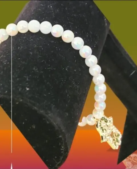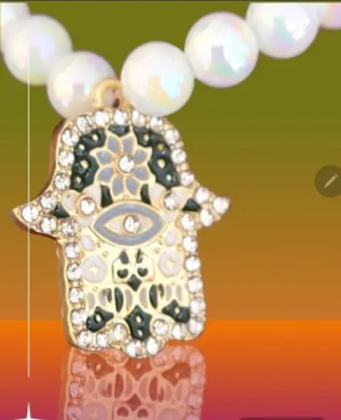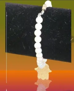 Pulcera de Cuentas de Perla Herradura. Pulcera de Cuentas redondas en color blanco con Pendiente de Herradura de Fatima con Ojo de acento y flor, piedras blancas en la orilla y detalles de fondo negro, cierre de rosca, mide 2cm de circumferencia y es elastica, nueva a estrenar