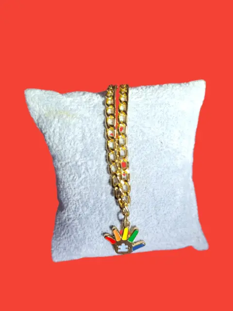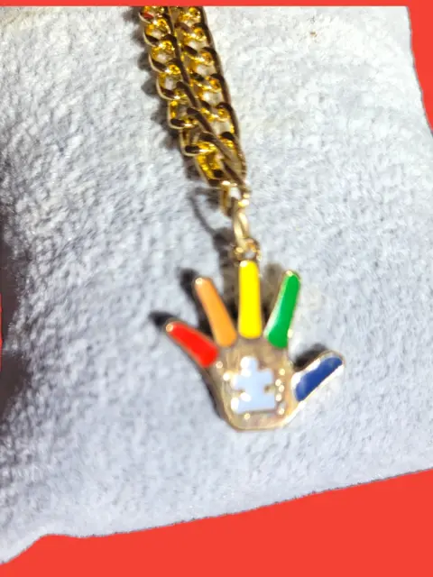 Pulcera Despertar Conciencia Autismo. Pulcera Despertar Conciencia Autismo de Cadena trensada en color dorado con dije en forma de mano multicolor, cierre de broche, mide 6cm de diametro, una pieza perfecta para que la use tu hijo(a), nueva a estrenar con bolsita de tela para guardar.