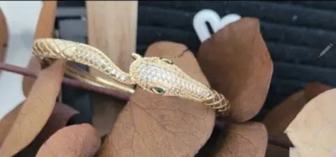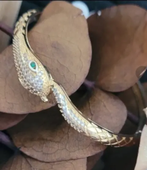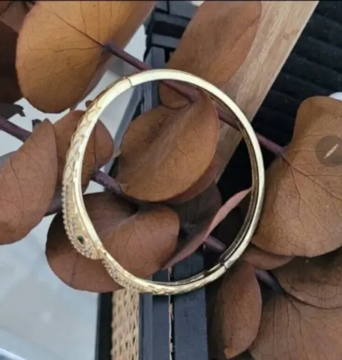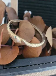 Pulcera en forma de cobra con ojos en piedreria Verdes y pequeñas piedras blancas de acento aproximadamente 2.5cm de diametro con cierre de Iman y una pequeña chapa de oro en todo el cuerpo luce espectacular con cualquier outfit y llevate las Miranda's de todos ad quiere la tuya antes de que se terminen