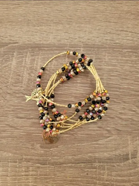 Multi-color semanario pulcera con dijes en multicolores y dorado con acentos de beads y multi dijes con cadena planchada de laminado en fantasia color dorado, tiene 5cm de circumferencia nueva a estrenar lucela con tus looks casuales o formal.