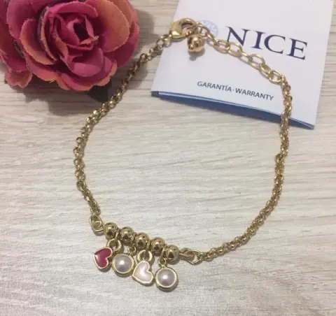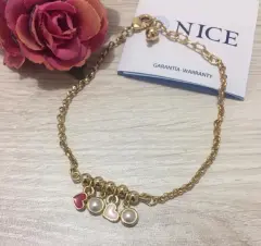 Linda pulsera marca Nice con 4 dijes, perlitas incrustadas y esmalte en todo rosa y rojo.Totalmente nueva