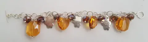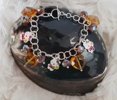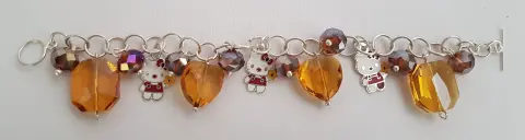 Pulsera eslabones circulares en alpaca tono plata c/dijes de Hello Kitty, cristal facetado forma corazón y hexagonal tono AMBAR y cierre p/gancho barra. Dimensiones cms: 19 largo.