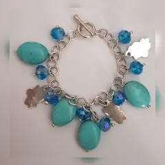 Pulsera eslabones circulares en alpaca tono plata c/dijes de Hello Kitty, cristal facetado color AZUL FRANCIA, turquesas y cierre p/gancho barra. Dimensiones cms: 16 largo.***LA PULSERA SE ENTREGA SIN CAJA, ESTA SOLO ES UN ELEMENTO DECORATIVO***