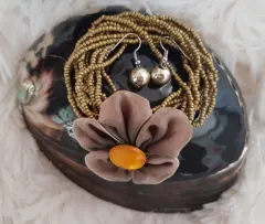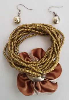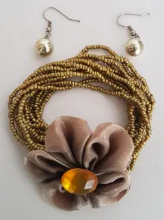 Pulsera Autoajustable en chaquirón tono DORADO c/dije flor en tela color MARRÓN DEGRADADO y aplique bisutería tono AMBAR. Incluye aretes perla sintética color DORADO. Dimensiones CMS: Pulsera 5 diámetro; aretes: 2 largo.