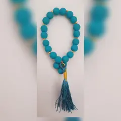 Pulsera autoajustable esferas acrílico en tono AZUL BONDI, esferas en oro laminado y copete. Dimensiones cms: 5 diámetro.***QUEDA A UNA MUÑECA DELGADA******LA PULSERA SE ENTREGA SIN CAJA, ESTA SOLO ES UN ELEMENTO DECORATIVO***