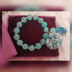 Pulsera Azul Dije Piedra Redonda. Pulsera autoajustable esferas acrílico en tono AZUL AGUAMARINA, dije piedra natural redonda efecto marmoleado, esferas en oro laminado y copete. Dimensiones cms: 6 diámetro, dije 3 diámetro.***QUEDA A UNA MUÑECA DELGADA******LA PULSERA SE ENTREGA SIN CAJA, ESTA SOLO ES UN ELEMENTO DECORATIVO***