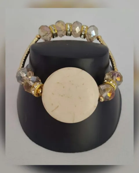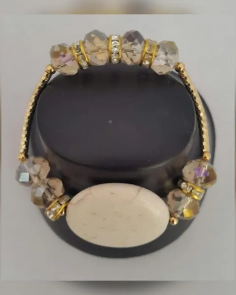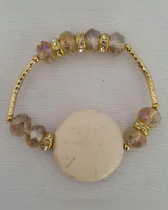 Pulsera autoajustable en oro laminado color DORADO, piedra y bisutería fina en tono MARFIL MARMOLEADO/CHAMPAGNE. Dimensiones cms: 6.3 diamétro.***QUEDA A UNA MUÑECA DELGADA***20 micras de oro 14 kilates adheridas a presión, calor y laser sobre metal (cobre o latón). El peso en oro de una pieza en oro laminado, corresponde a 1/20o de su peso total, o sea, un 5% oro.***EL BRILLO DE LA BISUTERÍA ES MUY BELLO Y LA FOTOGRAFÍA NO LO CAPTA. LA EXCELENTE CALIDAD DE LA MISMA, PERMITE QUE NO SE OPAQUE CON EL USO***