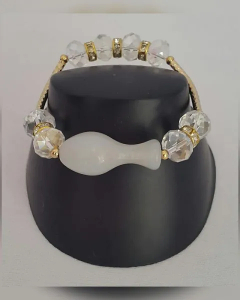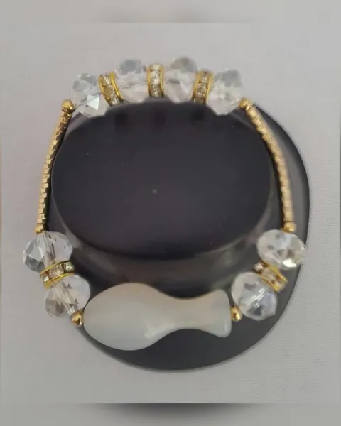 Pulsera autoajustable en oro laminado color DORADO y bisutería fina en tonos BLANCO LINO/TRANSLÚCIDO. Dimensiones cms: 6 diamétro.***QUEDA A UNA MUÑECA DELGADA***20 micras de oro 14 kilates adheridas a presión, calor y laser sobre metal (cobre o latón). El peso en oro de una pieza en oro laminado, corresponde a 1/20o de su peso total, o sea, un 5% oro.***EL BRILLO DE LA BISUTERÍA ES MUY BELLO Y LA FOTOGRAFÍA NO LO CAPTA. LA EXCELENTE CALIDAD DE LA MISMA, PERMITE QUE NO SE OPAQUE CON EL USO***