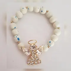 Pulsera Blanca Ángel. Pulsera autoajustable esferas acrílico tono BLANCO LINO c/destellos AZUL ROYAL, esferas y dije ángel (c/circonias) en oro laminado. Dimensiones cms: 6 diámetro, dije 3.5x2.5.***QUEDA A UNA MUÑECA DELGADA***