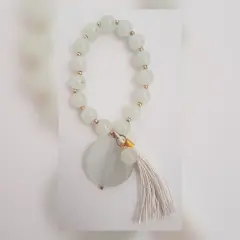 Pulsera Blanca Dije Piedra Redonda. Pulsera autoajustable esferas acrílico en tono BLANCO LINO, dije piedra natural redonda, esferas en oro laminado y copete. Dimensiones cms: 6 diámetro, dije 3 diámetro.***QUEDA A UNA MUÑECA DELGADA***