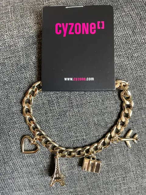 Pulsera wanderlust color dorada, de la marca cyzone, con 4 dijes de viaje. Completamente nueva.Precio de catálogo y tienda en línea $299