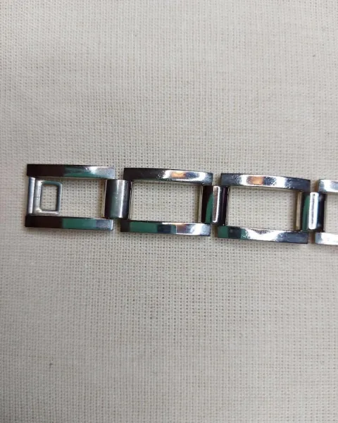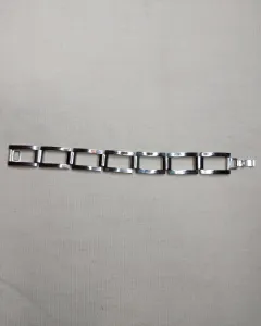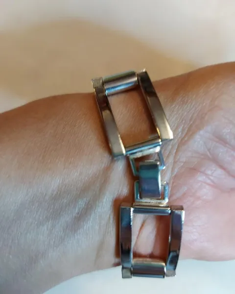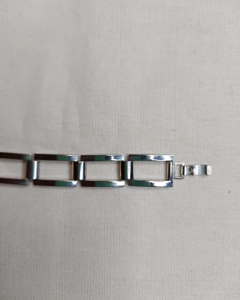 Pulsera con eslabones rectangulares plateada. Hermosa pulsera con eslabones rectangulares plateada, es un poco ancha, esta muy linda, tiene algún rayón pero no se nota. Mide aproximadamente 17cm. No se de que material sea, pero no está despintada.