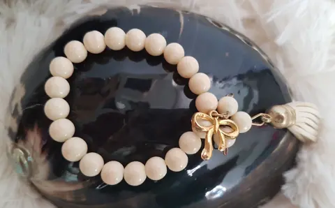 Pulsera Crema Moño. Pulsera autoajustable esferas acrílico en tono CREMA, dije moño en oro laminado y copete. Dimensiones cms: 6 diámetro.***QUEDA A UNA MUÑECA DELGADA***