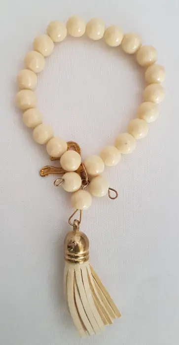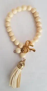 Pulsera autoajustable esferas acrílico en tono CREMA, dije moño en oro laminado y copete. Dimensiones cms: 6 diámetro.***QUEDA A UNA MUÑECA DELGADA***