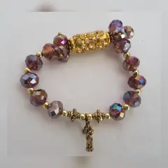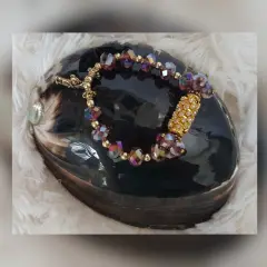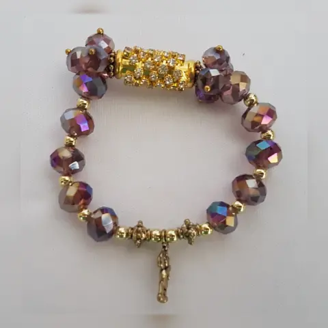 Pulsera autoajustable en cristal checo facetado color UVA TORNASOL, esferas en oro laminado, dije osito y conector microcirconia. Dimensiones cms: 6.5 diámetro.***EL BRILLO DE LA PULSERA ES MUY BELLO Y NO LO CAPTA LA FOTOGRAFÍA***QUEDA A UNA MUÑECA DELGADA***