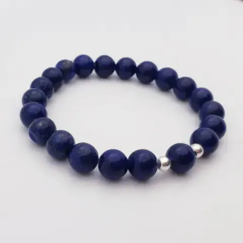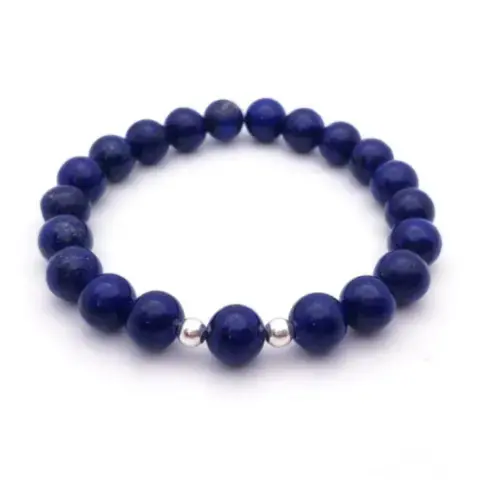 Hermosa pulsera de piedra natural con plataBolitas calibradas de piedra natural Lapizlázuli de 8 mmContiene dos cuentas de plata ley .925 de 4 mmHilo elástico resistenteBolsita de algodón almacenadora (el color puede variar)La piedra Lapislázuli es un mineral muy apreciado por su color característico de azul ultramar. Fue adoptada por la antigua cultura egipcia, que la utilizaron para el arte y decoración. Se le llamó "la piedra de los Dioses".En la cultura esotérica, esta piedra aporta seguridad en la persona que la porta. Infunde magnetismo personal y favorece el desarrollo de la intuición.Es utilizada por personas que pertenecen o pretenden pertenecer a un nivel jerárquico elevado en la sociedad (abogados, empresarios, gerentes, etc.).Anímate a probarla o regálala a esa persona tan especial.