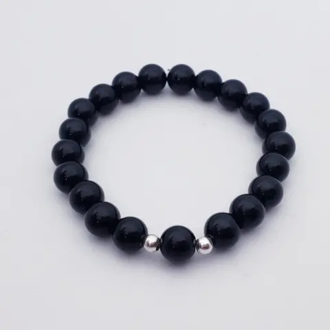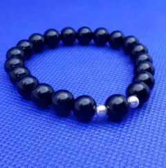 Hermosa pulsera de piedra natural con plataBolitas calibradas de piedra natural Obsidiana de 8 mmContiene dos cuentas de plata ley .925 de 4 mmHilo elástico resistenteBolsita de algodón almacenadora (el color puede variar).----------Se dice que la piedra obsidiana es una piedra protectora y transmutadora de energías. Su chakra regente es Muladhara o chakra raíz.Puede ayudarte a interiorizar más sobre los problemas que se te presenten. Al ser una piedra transmutadora, te ayudará mucho en el autocontrol de las emociones.Aunque sus beneficios los concede a personas de cualquier signo zodiacal, los de signo Scorpio son más afines a esta piedra.Las bolitas de plata le aportan un contraste muy elegante. Anímate a probarla.