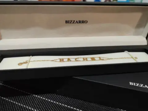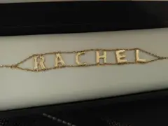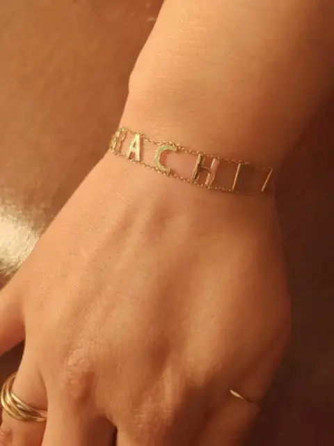 Pulsera de oro 14k Bizarro. Pulso de oro de 14k, con nombre, de la marca Bizarro. Oro italiano, tipo diamantado en las letras,17 cm de largo(tienes 3 aros para ajustarse el largo)Solo tiene como detalle en la parte de atrás de la letra E y C una pequeña marca de soldadura para reforzarlas(se muestra en última foto)✨🫶🏻Se entrega con su certificado de autenticidad,cubre polvo,estuche y bolsa.💯👌🏻