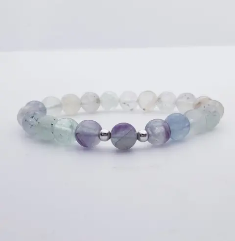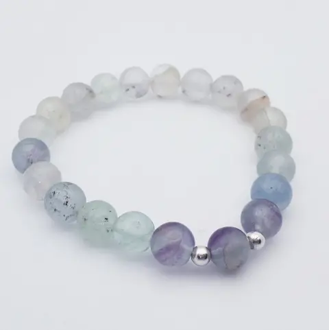 Pulsera de piedra Fluorita, con plata .925. Pulsera de piedras naturales• Elaborada con cuentas de piedra fluorita• Contiene dos cuentas de plata .925 de 4 mm• Cordón elástico resistente• Incluye una bolsita almacenadora (el color puede variar)La Fluorita es un mineral constituido, principalmente, por flúor y calcio. Es muy apreciado por su variada gama de colores que puede presentar, como tonalidades de violeta, verde claro, amarillo, rosa, verde azulado, entre otros.Se dice que la Fluorita fomenta el equilibro fisico-emocional en la persona que la porta. Es un equilibrante de energías, por lo que ayuda mucho en periodos en que la persona está padeciendo de obsesiones sentimentales con parejas tóxicas. También aporta claridad y equilibrio en el tema de los vicios, los trastornos alimenticios, entre otros.Es ideal para calmar los nervios y tener claridad de pensamiento.Animate a usarla.