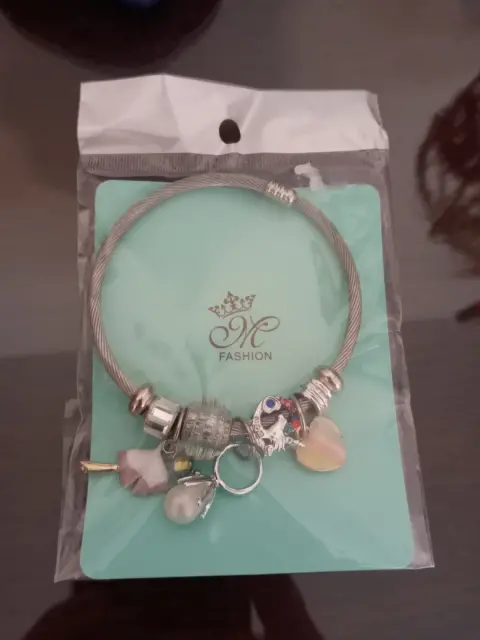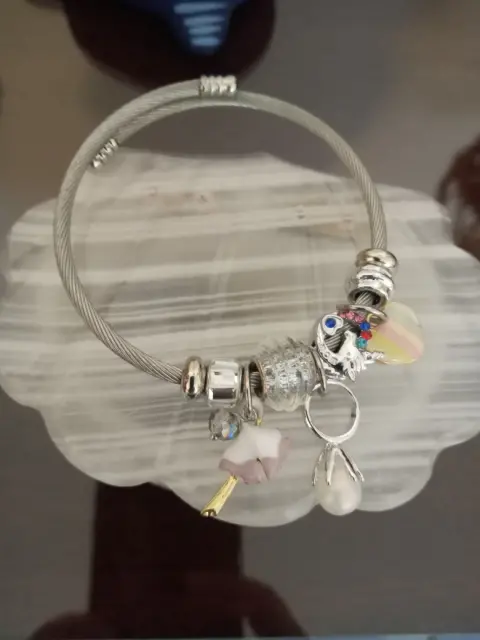 Pulsera dijes ajustable. Brazalete de acero inoxidable con charms de: Unicornio, Corazón de colores, Ginko y Anillo de perla.