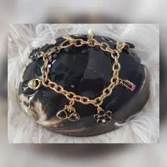 Pulsera Dijes modelo Lady. Pulsera eslabones forzados tono DORADO modelo "Lady", c/múltiples dijes esmaltado NEGRO/DORADO c/aplique circonias y cierre p/gancho barra. Dimensiones cms: 18 largo. Aleación de zinc.***EL ESMALTADO DE LOS DIJES ES MUY BELLO Y NO LO CAPTAN LAS FOTOGRAFÍAS***
